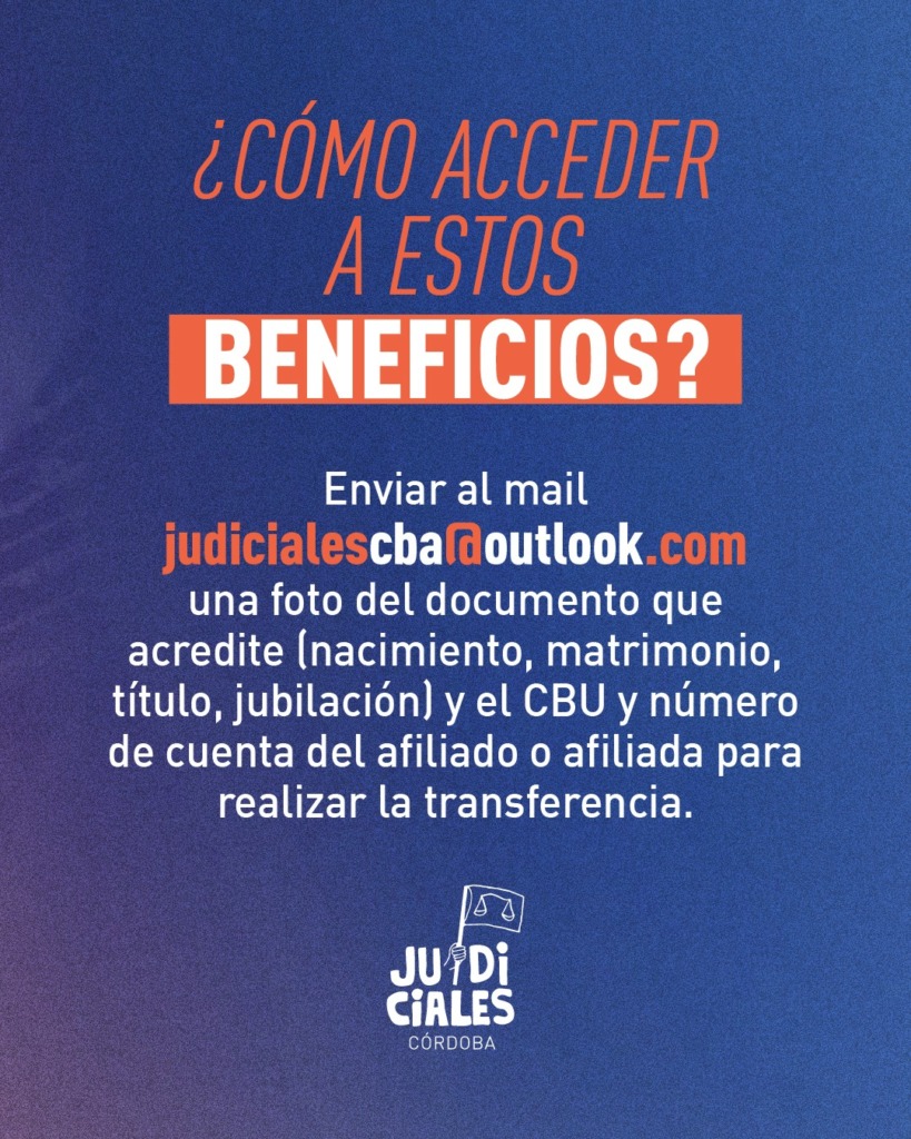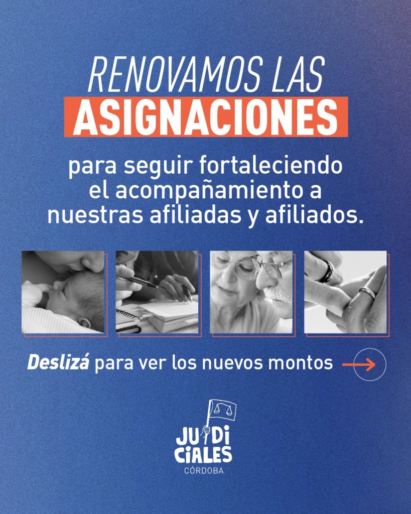 El Gremio de judiciales de Córdoba anunció que se estableció un aumento de todas las asignaciones que brinda el sindicato a sus afiliadas y afiliados. Las asignaciones que se otorgan por nacimiento, matrimonio, título y jubilación aumentaron a partir del primero de Agosto de 2025.