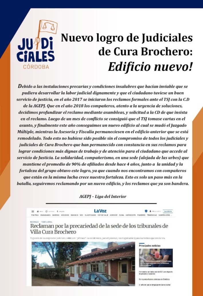 En tanto que Federico Cortelletti, secretario general de AGEPJ agregó que “Cada nota presentada, cada asamblea en la sede, cada afiche que pegamos, cada nota a un medio y cada vez que reiteramos el problema en la legislatura provincial en las audiencias por presupuesto fueron ladrillos que pusimos para construir este nuevo presente para las trabajadoras, los trabajadores y para toda la ciudadanía que busca justicia en Cura Brochero. Esto es un logro de esa lucha colectiva”.