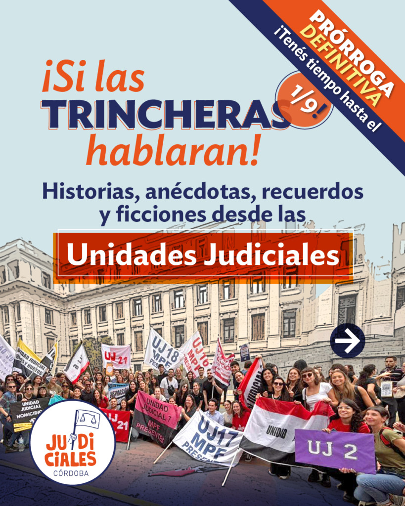 Ediciones Judiciales Córdoba convoca a las trabajadoras y trabajadores de las Unidades Judiciales de la provincia de Córdoba para presentar relatos, fotografías ó ilustraciones inspirados en el desempeño cotidiano en las “trincheras” . Con los textos presentados se realizará la publicación en un nuevo volumen de nuestra colección TONADAS JUDICIALES.