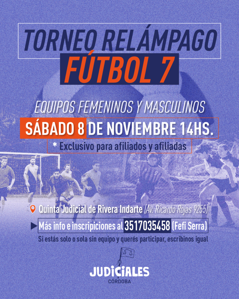 El pasado sábado 8 de noviembre se disputó el gran torneo relámpago de fútbol 7 en nuestra quinta de judiciales de Villa Rivera Indarte. Dicho encuentro estuvo organizado por Stefania “Fefi” Serra y Carlos Olmos integrantes de la Comisión Directiva del gremio de judiciales.