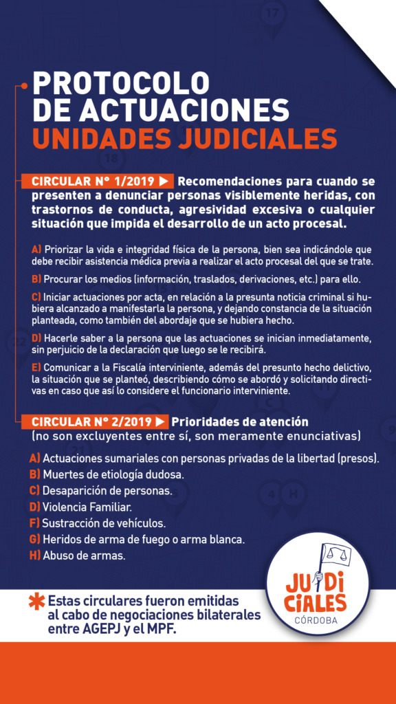AGEPJ recuerda que están vigentes las circulares 1/2019 y 2/2019 denominadas protocolo de actuación en unidades judiciales. Las cuales tuvieron un proceso participativo de elaboración por parte de sumariantes quienes, en el seno de AGEPJ, deliberaron y propusieron. Estas instancias, luego se convirtieron en resolución por parte del MPF, previa negociación bilateral con el sindicato.